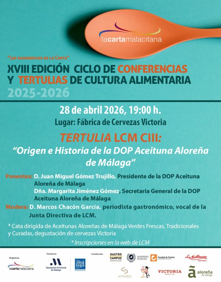 Tendremos como ponentes a D. Juan Miguel Gómez Trujillo, Presidente de la DOP Aceituna Aloreña de Málaga y Dña. Margarita Jiménez Gómez, secretaria general de la DOP Aceituna Aloreña de Málaga y estará moderado por D. Marcos Chacón, periodista gastronómico y vocal de la Juanta Directiva de LCM ¡Os esperamos!
