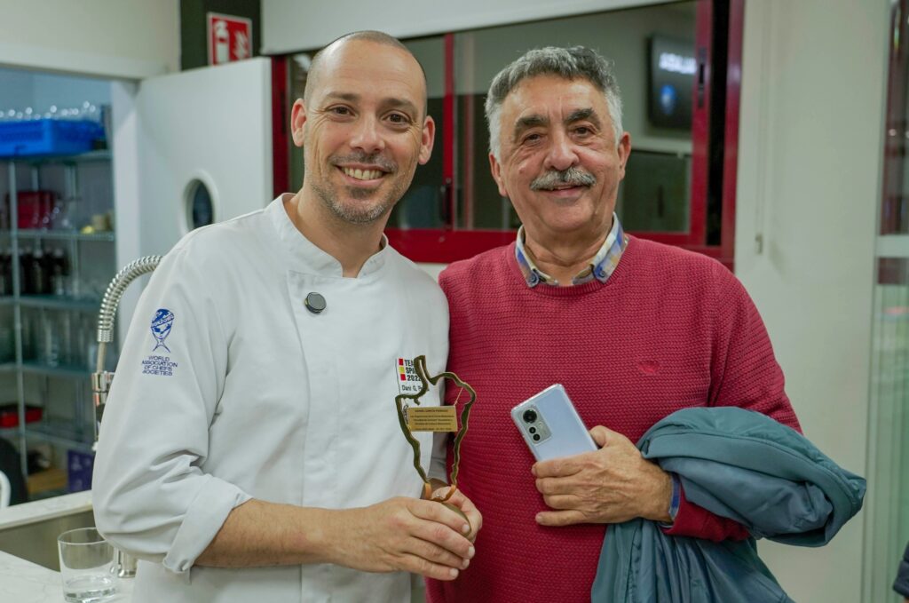 Posteriormente, ambos ponentes respondieron a preguntas de los asistentes que llenaban el salón, despejando algunas dudas que plantearon sobre la técnia correcta de freir, mientras Daniel, cocinaba unos boquerones con aceite de la variedad hojiblanca, rebozados con harina de trigo de Coín, que emplató sobre crema de mango, con unos pimientos asados al carbón. Esta tapa fue maridada con un vino blanco seco, de la variedad moscatel de Alejandría, Nilva con crianza en lías finas, de Bodega Nilva, que fue elegido mejor blanco seco de la D.O. Sierras de Málaga en el concurso de Sabor a Málaga de 2025.