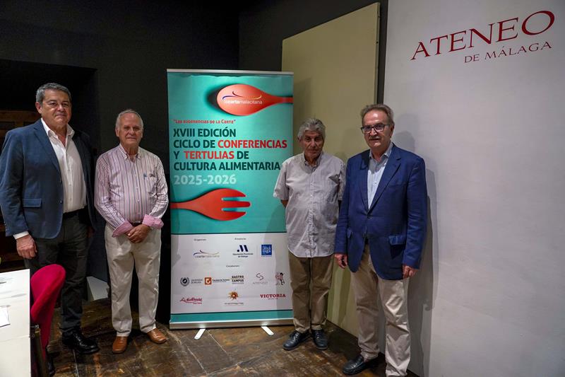 Previa a la intervención, el presidente de la Carta Malacitana, Antonio Carrillo, presentó el curso 2025-2026 de la entidad, que tendrá como sedes de conferencias y tertulias el Ateneo, el Pimpi, el Gastrocampus de la Facultad de Turismo de la UMA, Cervezas Victoria y , como novedad este año, se celebrará una conferencia en Antequera, exactamente sobre la producción en esta localidad de dulces navideños, respondiendo al interés de la Carta de extender sus actividades a toda la provincia de Málaga.