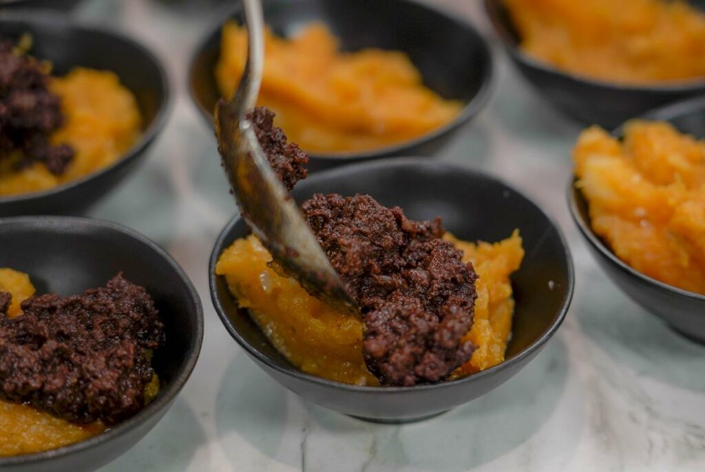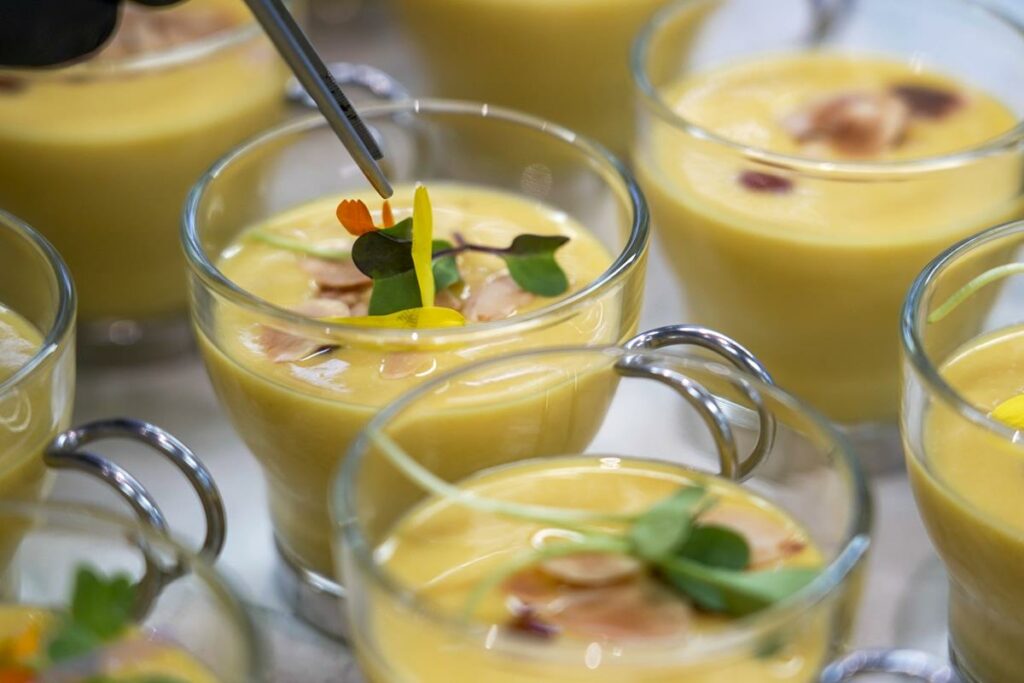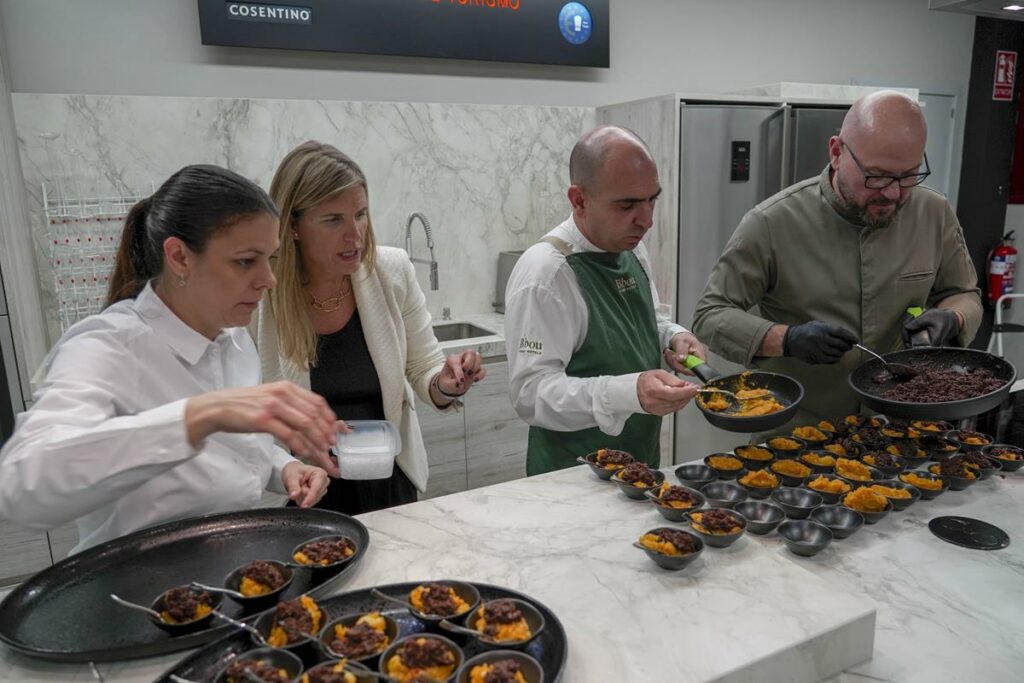Para cocinar, se debe mirar alrededor y saber qué nos ofrece la tierra. Esa es la tarea que describió el jefe de cocina, Manuel Gil, indicando que muchas de las elaboraciones salen de recetarios familiares y de platos populares. Como muestra, ofreció dos tapas: ajoblanco de mango con láminas de almendra de Almáchar y mortero de calabaza veleño con morcilla de Canillas, que fueron degustados por los asistentes que llenaban la sala de catas del Gastrocampus de Turismo. Ambas elaboraciones se acompañaron con un vino tinto roble de Bodegas Excelencia de Ronda, Tagus, un interesante monovarietal de cabernet franc, casi el único de esta variedad que se produce en Andalucía y que pertenece a la D.O. Sierras de Málaga, tal y como explicó el gerente y copropietario de la bodega, José Luis López Caparrós.